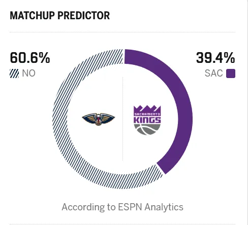 赛前,美媒ESPN预测本场比赛,鹈鹕胜率60.6%,国王胜率39.4%。